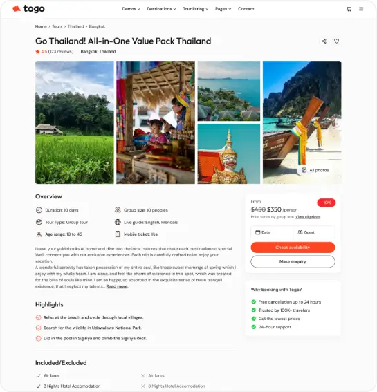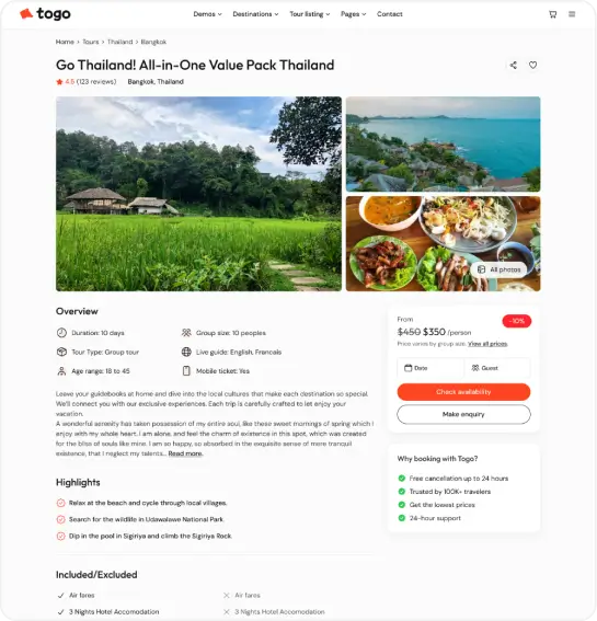 Togo – Travel & Tour Booking WordPress Theme is a modern and easy-to-use theme for travel agencies and tour operators. It offers powerful booking features, customizable itineraries, seasonal pricing, and WooCommerce support—perfect for creating a professional tour booking website.